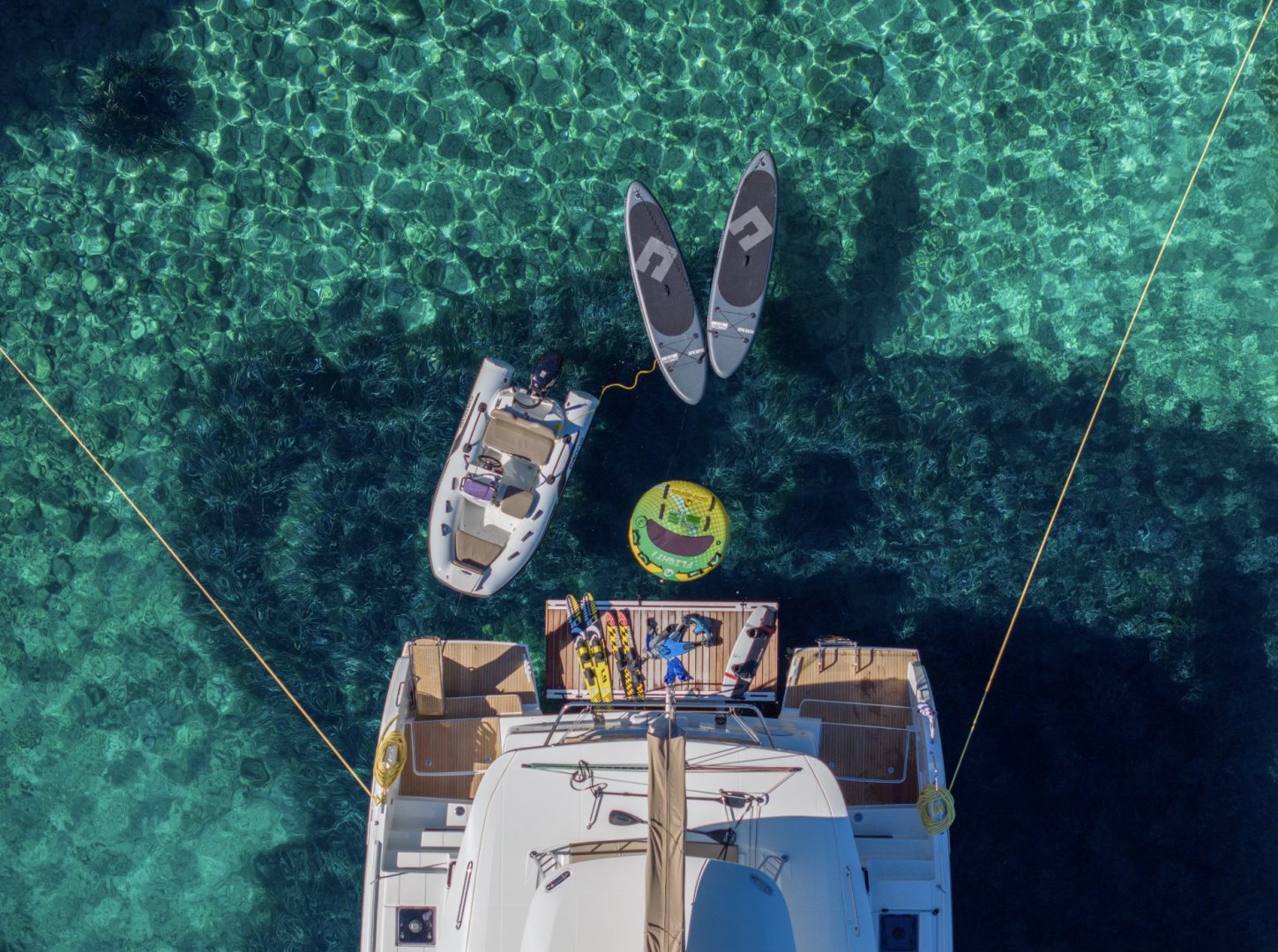 - An impressive selection of water toys including a luxury center console dinghy, adult and junior waterskis, wakeboards, towable tubes, stand-up paddleboards, and snorkeling gear