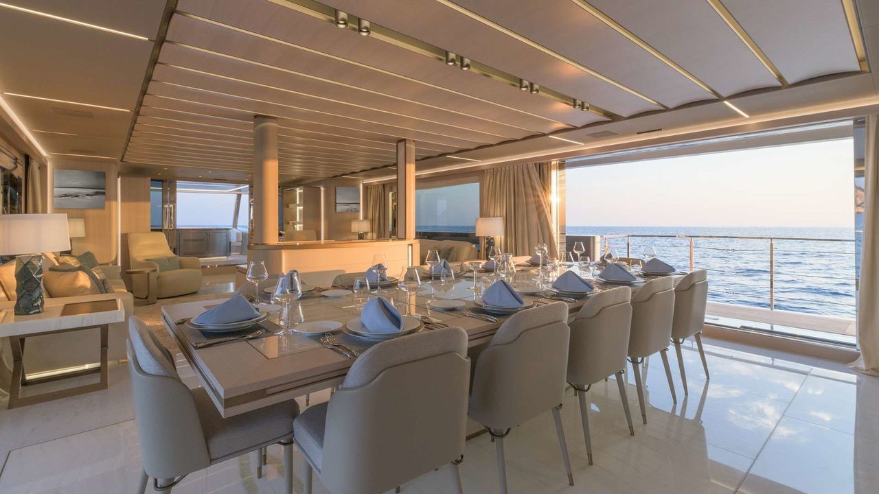 Last but not least, be prepared to be mesmerised by the striking interiors of this 5-guest cabin yacht, with a capacity for up to 10 guests on board. The yacht exudes opulence with its spacious and light-filled cabins, ensuring your utmost comfort throughout the journey. Experience the magic of cruising through the vast ocean on the Rossinavi Superyacht, expertly managed by our team.